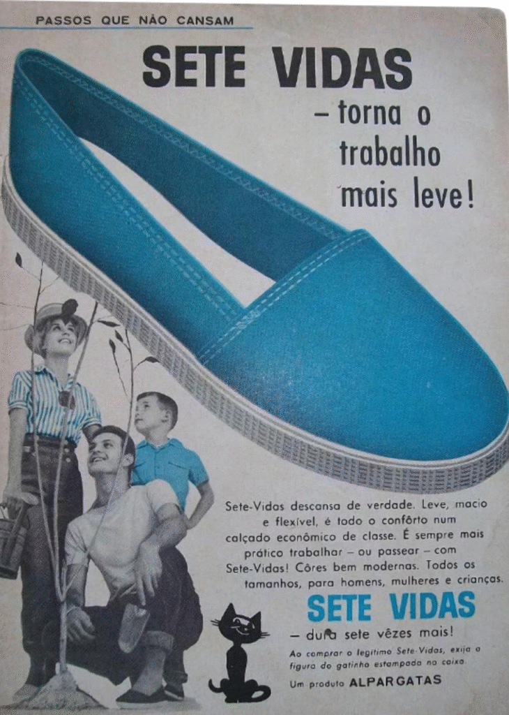 Em toda venda das cidades do interior havia uma porção de Alpargatas Roda penduradas logo à entrada. Também chamadas de Sete Vidas, eram feitas de lona e solado de corda. Ninguém queria usá-las pois achávamos que eram sinônimo de pobreza. Depois, a Alpargatas lançou a Conga, com solado de borracha, o que melhorou um pouco. Só um pouco…